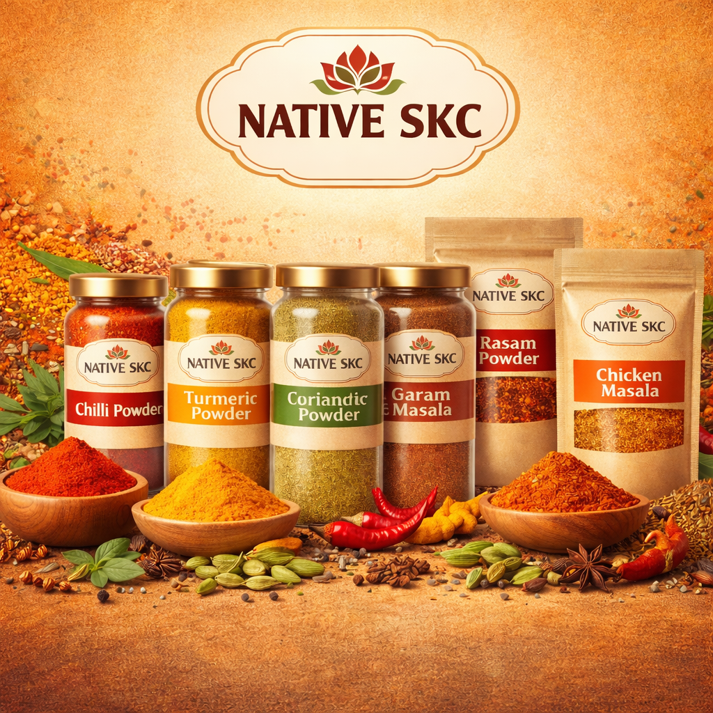 Native SKC Sambar Powder is prepared with handpicked spices and traditional methods to give your sambar a rich aroma and authentic South Indian flavor. Made without preservatives or artificial colors, it ensures purity and homemade quality in every meal. Perfect for daily cooking, our sambar powder makes every dish tasty, healthy, and memorable.